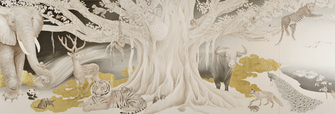 日本橋店を皮切りに全国5会場を巡回する今展では、「風鶴雷鶴図」など学生時代から描き続けてきた鶴や鳥を主題とした作品に加えて、多種多様なモチーフに初めて挑戦する。なかでも、力強く根を張る大樹に多くの生き物が集い、安息の表情を浮かべる幅6mに及ぶ大作「Dawn of Symphony」は必見と言える。東日本大震災をはじめ、世界各地で起こる悲惨な出来事が人々の不安を煽る中、作家自身が安息の場を求めていた心境が色濃く反映されたという本作、相反するものや異なるものを受け入れ、穏やかで安心できる時を願う作家の思いが、作品を通じて観る者の心に強く響くだろう。