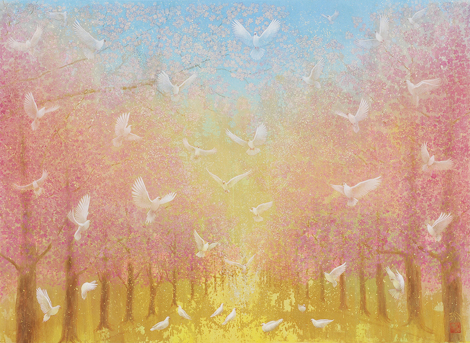 今展のテーマは「祈り」。福島県双葉郡富岡町の夜ノ森の桜を描いた3部作(掲出)や、きらびやかな屏風作品などを出品。鎮魂と希望を思わす、抒情ゆたかな新作群となる。