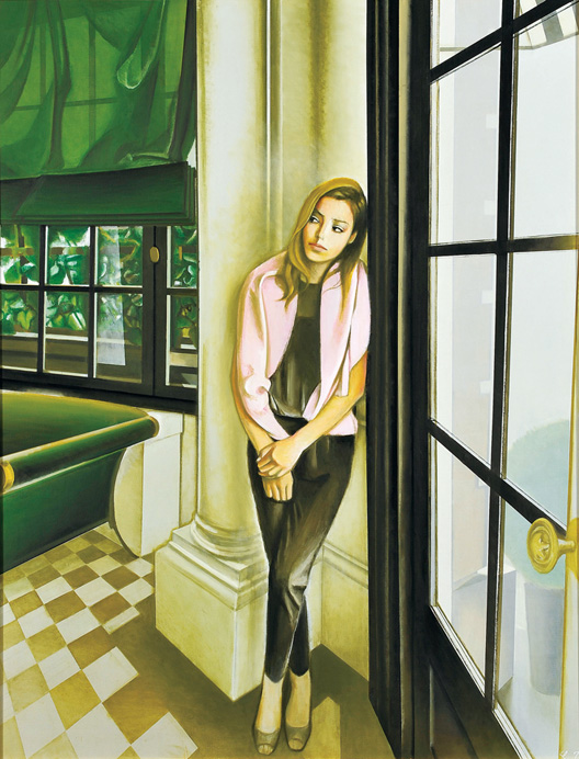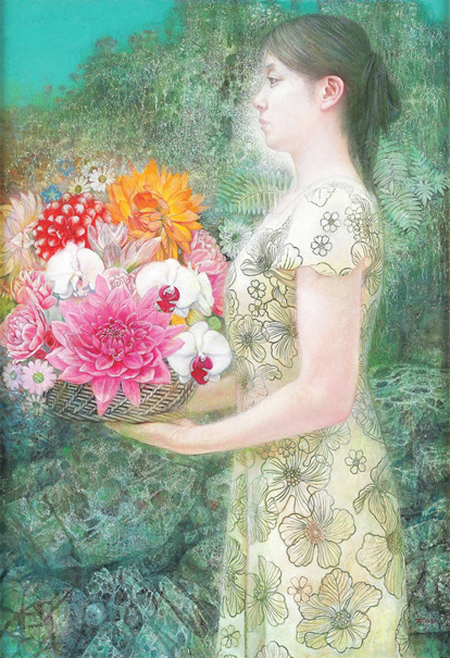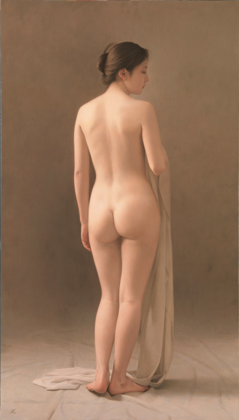 森本草介は描く対象とする女性そのものが持つ美しさを、ありのままに描き出す。脚色を抑え、より自然に、どこか禁欲的な風情もたたえつつ、美を一貫して追求していると言えるだろう。斜めの顔立ちはその全貌を想像させ、布地、床の質感、無限を思わす背景の処理が合致し、安定感がありつつ、同時に緊張感も醸しだしている。どこまでも奥行きのある、生命の美である。