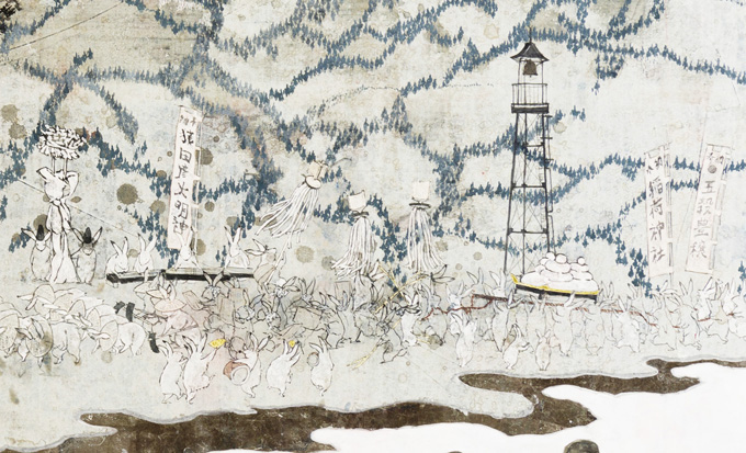 東北の様々な地域でレジデンスをしながら、その地域の伝承をお年寄りから聞いたり、地誌を調べたり、そこで発見したことを絵のモチーフに組みこんでゆくその作品は、洛中洛外図屏風と同様、細部をみることから出発し、より大きな全体の意味を読み解くものが多い。
