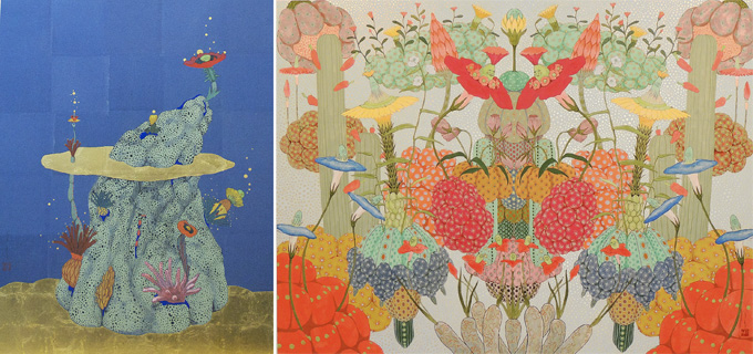 (左)いとうまり《欲望の根源 -様々な価値観の根底-》2012 岩絵の具、水干絵の具、墨、にかわ、胡粉、金箔、木製パネル、門出和紙 920x730mm
