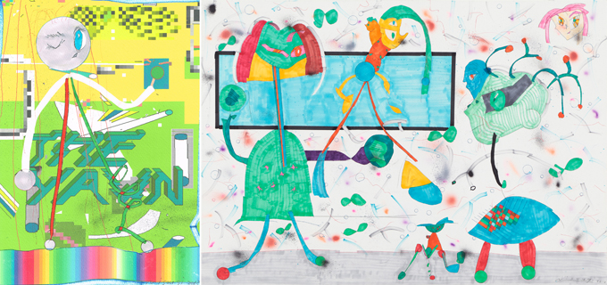 (左)二艘木洋行《梨》2013 インクジェットプリント、ペン、スプレー、マーカー、紙 297x210mm