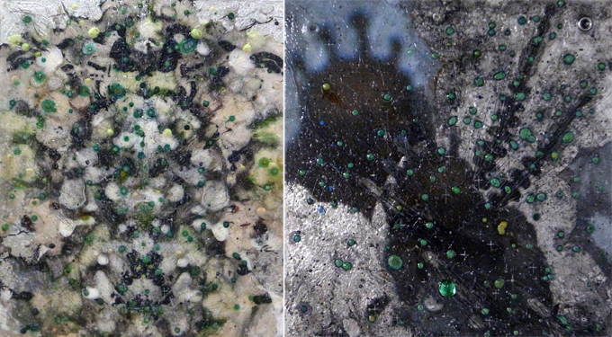 (左)《Heterophony》2014 45.5×38cm 白麻紙、青墨、胡粉、アクリル、金属粉、アルミ箔、パネル
