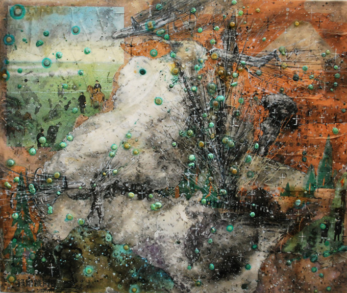 《Vernacular Painting》2014 38×45.5cm 雲肌麻紙、青墨、金属粉、アクリル、印刷物、金