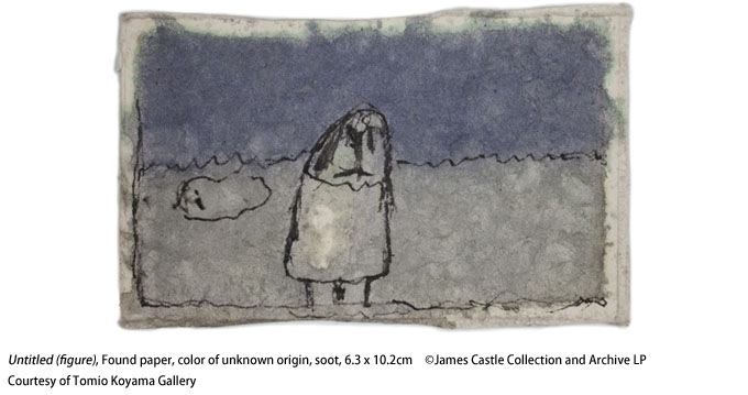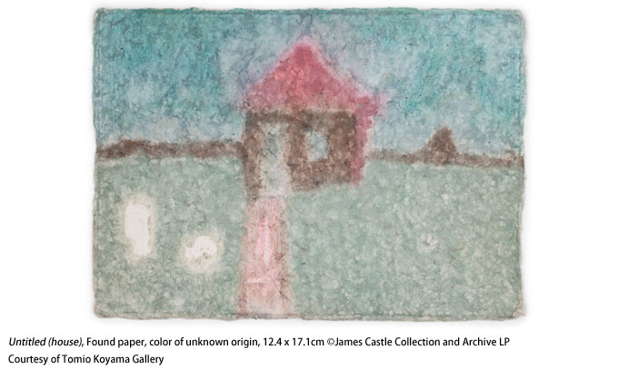 ジェイムズ・キャッスル(1899~1977)はドローイング、コラージュの立体作品、ハンドメイドの本などを、独学でその一生を通じ制作 したアーティスト。生まれた時から耳が聞こえなかったキャッスルは通常のコミュニケーションの方法をもたず、また正式な美術教育も受けなかったが、70 年近くもの作家人生で類を見ない様々な作品群を残した。ドローイングには暖炉のすすと唾液を混ぜた独自のインクを使用し、尖った棒や丸めた綿などを使って制作。とらえがたさ、鈍さと鋭さ、動き、新鮮さ。素材と関わる際の触覚を生かした ドローイングは、非常に豊かで様々なテクスチャーとトーンを持っているといわれている。 2009 年のニューヨーク・タイムズ紙で美術評論家のロベルタ・スミスによって「構造、動くパーツ、そして見慣れたフォルムの抽象化の理解 において、アレクサンダー・カルダーがワイヤーを扱ったように、キャッスルは卓越したやり方で段ボール紙を使った」と評されたキャッスル。