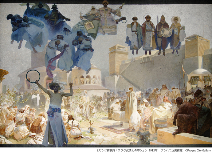 美しい女性像や流麗な植物文様など、華やかで洗練されたポスターや装飾パネルを手がけた一方で、ミュシャは故郷チェコや自身のルーツであるスラヴ民族のアイデンティティをテーマにした作品を数多く描く。その集大成と言えるのが、晩年の17年間を捧げた《スラヴ叙事詩》だ。縦6メートル、横8メートルもの巨大なカンヴァスに描かれた20点の油彩画は、古代から近代に至るスラヴ民族の苦難と栄光の歴史を圧倒的なスケールで描きだしたもので、プラハ市のために描かれ、1928年に寄贈された。ミュシャの最高傑作にして、今日ではチェコ近代美術史上、最も重要な作品に位置付けられている。