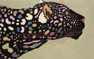 ジャガー9点の連作「九相図」など新作約15点が出品。10月3日~9日の松坂屋名古屋店の後、東京に巡回する。東美アートフェア・村越画廊ブースでは、入口を飾る「阿吽の豹」を見ることができる。