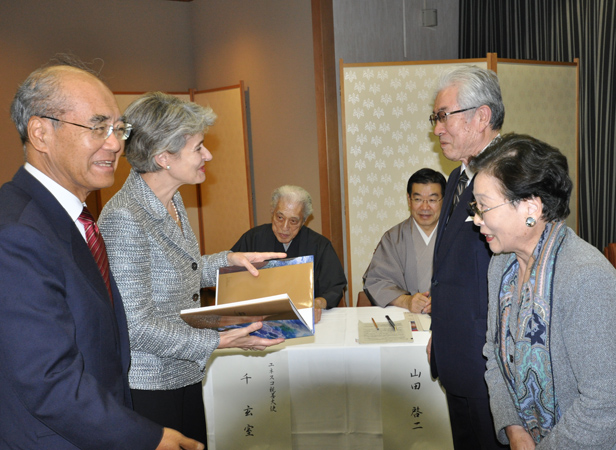 奥谷夫妻より贈られた画集「奥谷博展―訪ねた世界遺産」を手にするイリーナ・ボコバ ユネスコ事務局長と松浦晃一郎氏