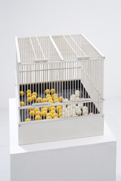 飯田昭二「Half & Half(ピンポン玉)」 1968年 鳥かご、ピンポン玉、鏡 50x50x51.5cm Courtesy of Tokyo Gallery+BTAP