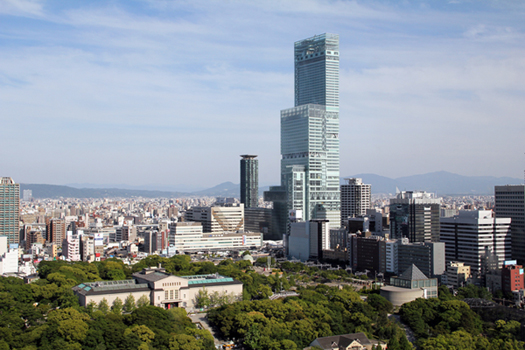 新たなランドマークとなる超高層複合ビル「あべのハルカス」。左下は天王寺公園の大阪市立美術館。