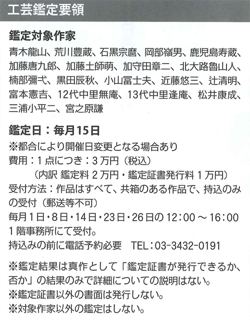 また、鑑定を始める一番大きな理由は、工芸の場合、ご遺族の方が中心になって鑑定をされている場合が多く、必ずしも100%制度化されていないことです。最近ではご遺族の方も高齢化されて、どこに鑑定を持っていっていいか分からなくて、お困りになっていている方もたくさんいらっしゃると聞きます。現在、ご遺族の方やお弟子さんなどがきちんと鑑定されているところは問題はないのですが、欠けている部分があって、私どもに出来ることがあれば、そこを埋めていきたい、流通のお手伝いをしていきたい、そんな思いから始めました。また、工芸は国内だけではなく、海外でもたいへん評価が高くなってきました。国内の市場性を固めなくてはいけないと感じています。