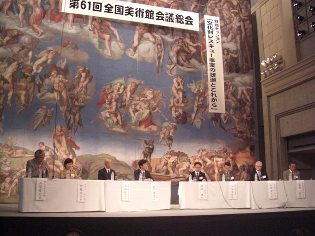 特別セッションのテーマは「文化財レスキュー事業の経過とこれから」。被災文化財を守るため、昨年4月発足した救援委員会によるレスキュー事業は現在も継続中。全美も各地の会員館から100名を超える職員が被災地域で救援活動に参加した。