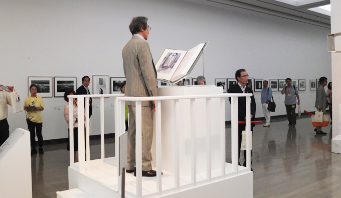 「ビッグ・ダブル・クロス」正面の祭壇には、今展のために制作された”世界でたった1冊の本”「Moe Nai Ko To BA」。本書には「忘却」というテーマに関わる詩や戯曲、写真や素描などが収録されており、会期中は観客が自由に閲覧できるほか、リーディング・パフォー マンスが不定期で開催される(写真)。会期終了後「消滅パフォーマンス」によって廃棄される「忘却の本」、ここでしか読むことは出来ない。