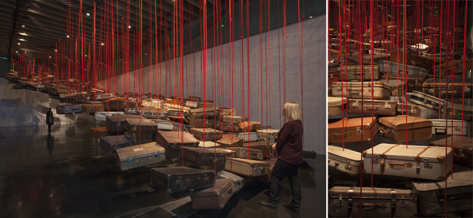 塩田千春《Accumulation-Searching for Destination》  2014年 Installation, Vintages suitcases, red rope, Dimensions variables
