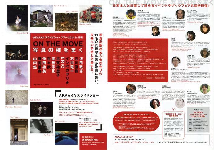 同イベントには浅田政志、石川直樹、石川竜一、インベカヲリ★、ERIC、古賀絵里子、高橋宗正、百々武、仲田絵美、藤岡亜弥、山内悠の11名が参加。12月13日~15日の会期中に、「AKAAKA スライドショー 2014 in 那覇」(12月13日)、「AKAAKAミーティングプレイス」(12月14日)、「AKAAKAブックフェア」(12月1日~31日)、「写真家・石川竜一氏の出版祝賀会」(12月13日)、「AKAAKAスライドショーツアー2014 in 宮古島」(12月15日)の5つのイベントが開催。写真家と写真、そして鑑賞者の直接的なコミュニケーションの場となる。
