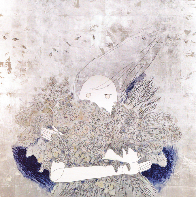蝦原由紀(加藤由紀)《ヤヌス》 鳥の子紙に胡粉・箔・岩絵具・ダーマトグラフ、1620×1620mm、2014年