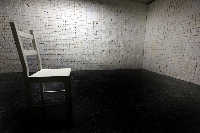 吉本直子「鼓動の庭」2012年 古着の白いシャツ、椅子