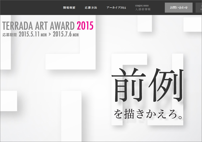 「TERRADA ART AWARD 2015」の応募受付は2015年5月11日より開始。書類審査による1次審査と、1次審査通過者(50名前後)の未発表作品各1点を審査する最終審査を経て、入選・入賞作品が決定される。