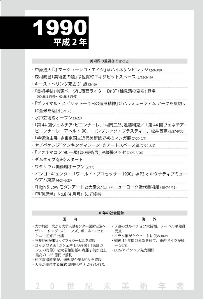 また各年の社会情勢とともに、美術界の重要な出来事がピックアップされた年表を掲載。このほかエッセイ・論考として「未知の空気の追体験―平成の日本美術形成史」(小金沢智)、「美術館建築ワースト/ベスト1? 」(永瀬恭一)、「アート系ウェブサイトの黎明期」(中村ケンゴ+永瀬恭一)、「ポストモダンなコンテンポラリー/現前するコンテンポラリー」(対談:眞島竜男×中村ケンゴ)なども収録されており、整理され切っているとは言えない90年代~00年代アートシーンに多角的な視点で切り込む内容となっている。