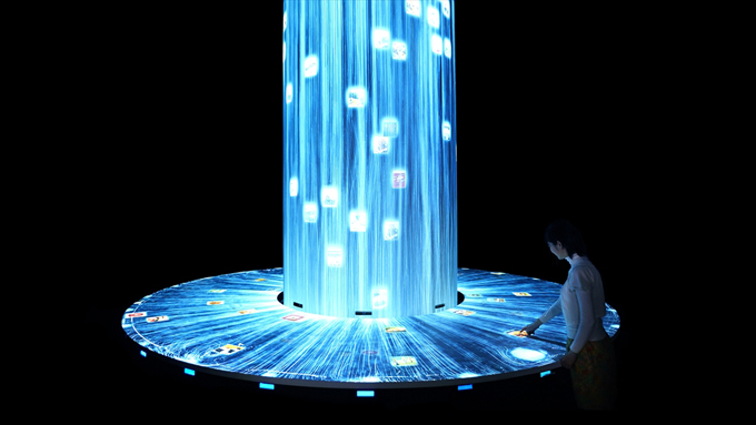 また「DIVERSITY」は食の源である日本の水を、象徴的に滝で表現。食の多様性(DIVERSITY)という大量の情報を来場者に伝えるために、 360度どこからでも鑑賞できる巨大な滝に、食に関連する大量のコンテンツの画像が流れる。来場者は、流れてきた画像にタッチすると、画像と詳細の情報が、自分のスマートフォンへと取り込まれ、持ち帰ることができる。同じ空間にいる来場者が、体感を共有できるシンボリックな滝と、個人が持つスマートフォンを繋げることによって、感動の共有と、大量の情報に対する利便性を共存させるチャレンジを行うという。