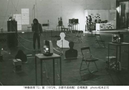 「映像表現 ’72」展の正式名称は「第5回現代の造形< 映像表現 ’72>もの、場、時間、空間-Equivalent Cinema-」。1972年10月、京都市美術館でわずか6日間だけ開催された展覧会は、大陳列室約400㎡を使用し、映画館やホールでの上映ではなく、展覧会形式で複数の作家の映像作品を発表した国内初の試みだった。当時の出品作家は石原薫、今井祝雄、植松奎二、植村義夫、柏原えつとむ、河口龍夫、庄司達、長澤英俊、野村仁、彦坂尚嘉、松本正司、宮川憲明、村岡三郎、山中信夫、山本圭吾、米津茂英の16名。映像作品がそこかしこの壁やモニターに映し出され、映写機やビデオデッキ、スライドプロジェクターの機械音が響く会場には、エンドレス上映するためにフィルムが蜘蛛の巣のように張り巡らされ、独特の空間を生み出していた。