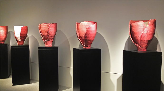 今展の大きな特徴は、作品に施された「赤」。赤絵の顔料を用いたというこの赤は、作家ならではの原初的で力強い造形をより強調させ、なかでもギャラリー中央のスペースに並ぶ5つの連作は、太古より時を超えて今にあるかのような荘厳さすら感じさせる。その他、水指や碗など15点による展観。従来の陶芸という枠組みを超えて、器というものの原点に迫ろうとする小川の新作をぜひ楽しんでほしい。