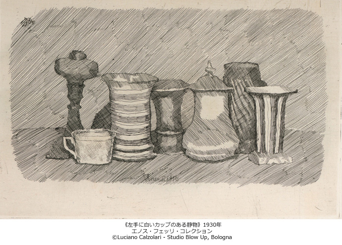 日本では17年ぶりとなるこのたびのモランディ展は静物画を中心とする約100点で構成され(17年前の展覧会は花と風景という変化球的なテーマだった)、「終わりなき変奏」の副題どおり、同一の瓶や壺などをしつこく描いたこの画家の、方法としてのバリエーションをテーマとしている。わずかな入れ替えで全く異なる画面の統一を見出す画家の力量と細やかな冒険の軌跡を辿るのは、とても楽しい。