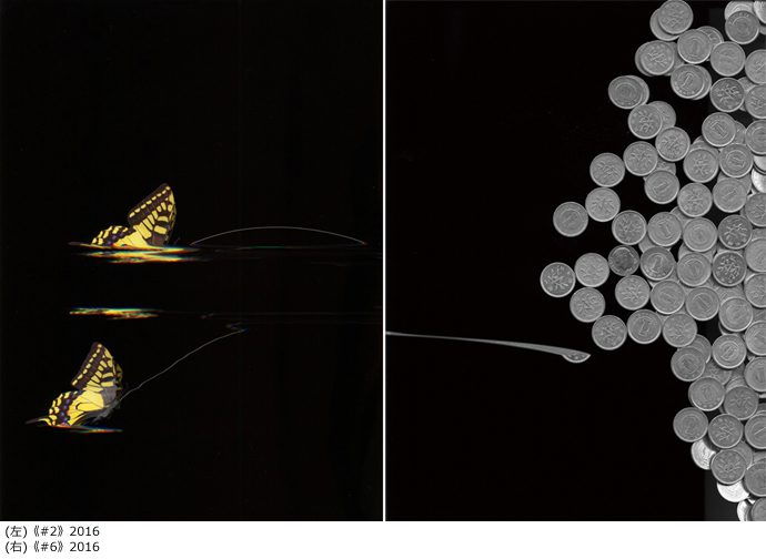 複数のスキャナー上に設置され、独自の装置によって動かされるのはリボン・毛ばたき・ロープ・蝶のおもちゃ・コイン・LEDライトなど、これまで毛利作品に登場してきたおなじみのオブジェたち。このオブジェの動きは、それぞれのスキャナーによって継続的にスキャニングされ、画像データがハードディスクに続々と保存されていく。スキャナーが動いているかぎり半永久的に増えつづける像のあり方は、直線的に時間が進む動画(ムービー)とは違ったかたちで、運動や時間を含むものとなるという。