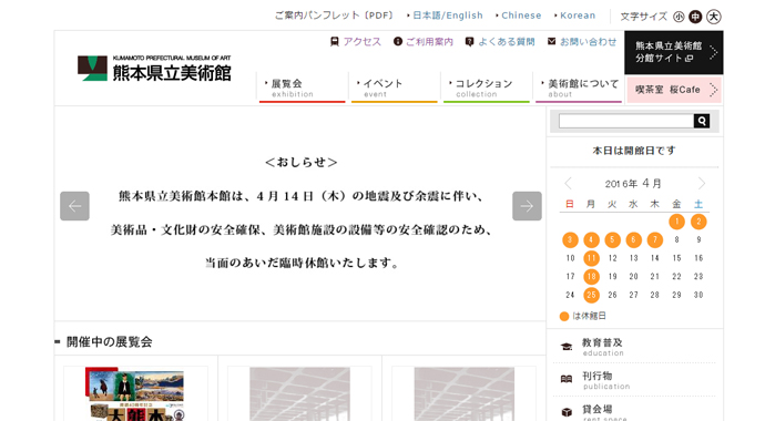 一方、熊本市現代美術館(同)では可動壁のずれや作品の落下があったものの、現時点では重大な損傷は認められないという。しかし空調設備が稼働しない状態であり、展覧会の再開については今後検討を重ねるとのことで、同館も当面の間休館となっている。