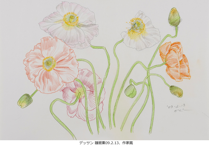 千波は作品を制作するとき、おもちゃは実物を見ながら画面に直に描くが、花を描く際には過去のデッサン帳を傍らに置くという。花には季節があるため、デッサンの中にその花の最も美しい時を描き留めておく。そしていざ作品を制作する時に再びデッサンの中から描き出すのである。作品に描かれた花は、どれもが本物の花同様に生き生きとして見える。それは、その画技もさることながら、図鑑や写真から写すのではなく、実際の植物をデッサンして描き取ることを基本とする制作の姿勢によるのだろう。