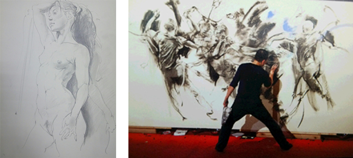 左:人物クロッキー 右:パリ日本文化会館(パリ)における「本能寺のD」公演の様子