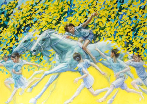 近年取り組んでいる「レモンの森」シリーズは、イラク戦争前にシリアを旅した際に、そこで見たレモンの木々や狩猟の壁画などから発想を得たのだという。白馬や少年少女が駆けるレモンイエローの画面には、祝祭的な幻想世界が隅々まで広がり、作家の新たな展開を感じさせる。レモンの産地・広島での今回の凱旋展では、その詩情溢れる絵画の中に、広田の原風景のようなものも見ることができるかもしれない。