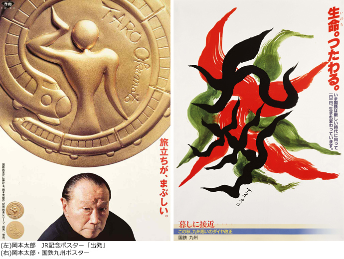 山陽新幹線開通の岡山駅に壁画《躍進》をつくり、国鉄が国営化された記念として公式メダル《出発》をデザインするなど岡本太郎は鉄道との縁が深いアーティストだった。荒野を切り開き自然と抗いながら鉄路を開拓した時代から人々は夢を託して街をつくり、人と文化の交流を通して様々なドラマを生んできた鉄道は文化の象徴として存在している。