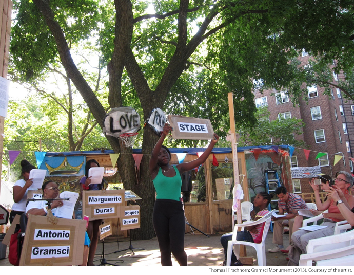 今夏東京にて行われている「ダダ100周年フェスティバル」の一環でもある今展は、アートにおける地域コミュニティーとの協働と関与について考察するキュレーション展。ダダから多大な影響を受けるヒルシュホルンが、自身の敬愛する4人の哲学者(スピノザ、バタイユ 、ドゥルーズ、グラムシ)に捧げたモニュメントと、シエラによるドキュメント映像を取り上げる。