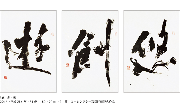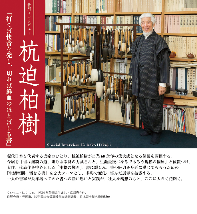 杭迫 大卒後に付いた先生が村上三島 (さんとう) 先生です。三島先生は「俺は灯台みたいなものだから、間違った時は言うけど、そうじゃなかったら自分で好きなようにやれ」と言って下さいました。三島流の真似をしろと言われたら多分辞めていたでしょう。京都には村上門下に古谷蒼韻、山内観、中島晧象ら先輩方、仲間に吉川蕉仙、宮崎葵光等がいます。皆自分の書をつくり上げる姿勢でやってきました。あれは三島先生が偉かったからです。その古谷先生からは最も感化を受けました。世間話は一切しない、書が悪かったら一切認めないという先生です。