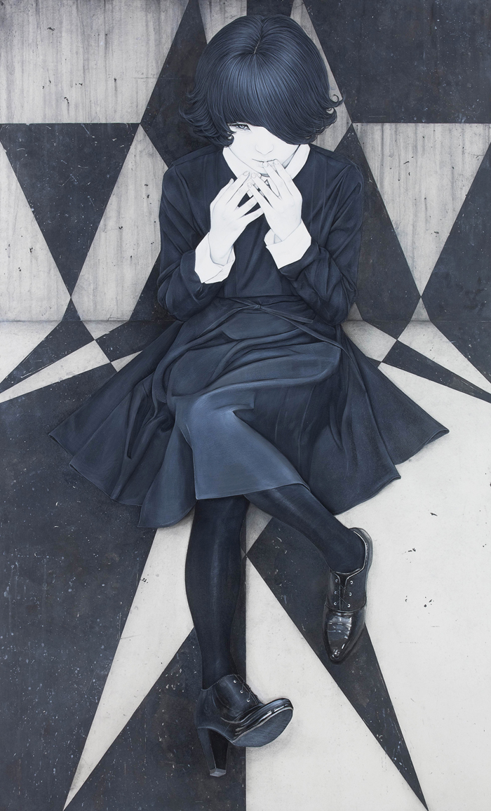 川島優は、浜松学芸高等学校芸術科から愛知県立芸術大学・大学院の美術研究科日本画専攻に進学し、現在は同大学院博士後期課程に在籍。「FACE展2014」グランプリ、「第6回トリエンナーレ豊橋 星野眞吾賞展」優秀賞など評価を得つつ、院展への発表も継続する。モノクロームを基調に、無機質な都会的空間、そして繊細に描写された女性像から画面は構成され、作家の内なる感情が託された作品の世界観が、見る者を引き込む。