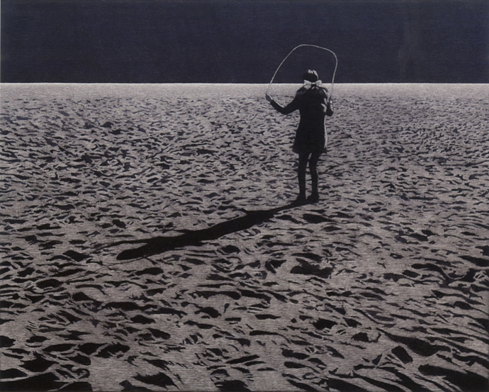 今回は砂浜を舞台とし、足跡や轍を一つの「影」として捉えた作品を中心に展示。八島は「80年以上生きてきた中で、色んな人の影を踏んだり、すれ違ったりして、人の痕跡に触れてきたことに今改めて気づいた」のだと語る。たびたび描かれる目隠しした人物は、失明した被爆者や、光のない世界を生きる人など、様々な命を連想させる。また、哀しい由来が隠されているとも言われる「はないちもんめ」「かごめかごめ」を1人で遊ぶ人物も印象的だ。モノクロームの世界に刻まれたいくつもの像について、想いを巡らせたい。100号からサムホールまで、新作22点が並ぶ。