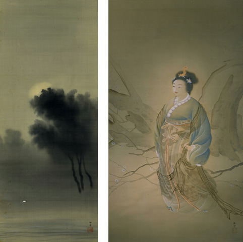 (左)西郷孤月《月下飛鷺》松本市美術館蔵 (右)菱田春草《羅浮仙》長野県信濃美術館蔵
