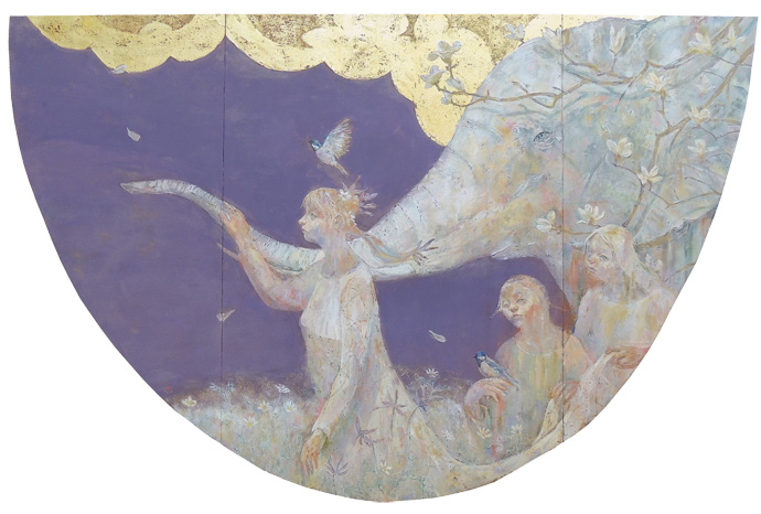 第三章では「生命のつながり」として、主体美術協会会員の山本靖久と二紀会委員の木原正徳を紹介する。豊かな自然の恵みとともに、穏やかな表情をたたえた人間が描かれる山本の作品は、人間の生命の根源的な記憶に共鳴し、遥かなる楽園に想いを馳せることができるだろう。木原正徳は、つややかで透明感のある画面に、移り変わる「自然」と象徴的な「人」とが絡まりあう世界を豊かな色彩で描き、境界を隔てることなく混然一体となって生命が循環する様子を表現している。作品の中で描かれる生命の交響は、人間だけでは生きていけない世界において、生命とは、生きるとは、本当の豊かさとは何かを考えさせられる契機となるだろう。