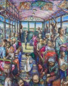 そして第3章「道」では、シルクロードの土地に生きる人々の暮らしと自然を描いた入江一子、市電が走り和服姿の人々が路地を行き交う昭和の街の情景を再構築する玉虫良次、故郷ベラルーシの自然、家族、花や果物を、乳白色の深い幻想的空間で包み込む近藤オリガ、そして重厚なマティエールに支えられた大地と、遠方に見える山並みに挟まれた深い空間が魅惑的な《地の風景》で知られる久野和洋を紹介する。