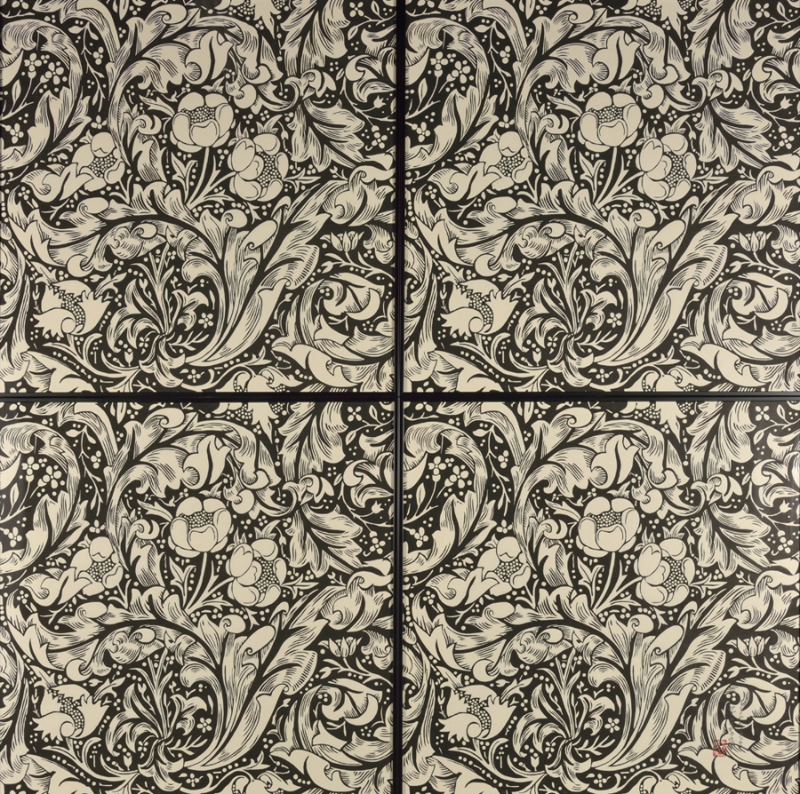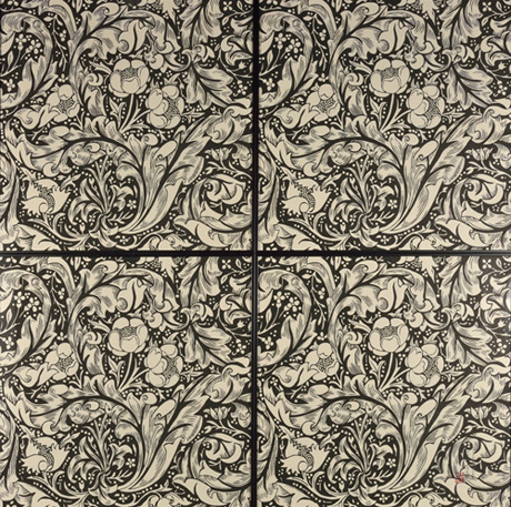ウィリアム・モリスの作品に出合ったのは何時頃か忘れた。モリスは身近な自然の中から、日常生活の親しげなるものを美しくしようとつとめてきたのだ。作り手、使い手双方にとって同時に喜びであるとのモリスの心に打たれた。文様化されたデザインの中に花、葉、茎などを全面に活気づけている。アカンサスの葉や柳葉の中に。パターンが空間効果を作り出し、春のいぶきを感じさせたりしている。 私の心の中にモリスが言っている。これからも人間の手によって作られていく美を墨の中に求めていく。
