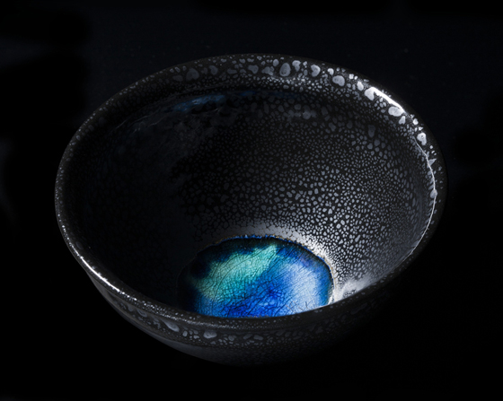 沖縄で採れる鉱石を主体に粉末にし、透明のガラスと融合、特殊焼成によって沖縄の海の青を発色させています。 掲出の茶碗も沖縄で採れる鉄鉱石を主体に制作しました。 マリンブルーのガラスは沖縄の海や地球を彷彿とさせ、油滴天目による景色は星空や宇宙をも想像させます。 ギャラリーを訪れる訪問客はもとより、海外の展示会でも高い支持を得ています。 |