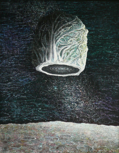 地球の象徴である白菜は、月を見つめる目のような別の銀河を内包し、