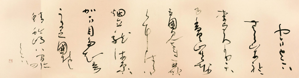 紙面に対する文字の配置、行構成など、長歌としては十三句にすぎないが、よく整った格調の高さをいかに表現するかに苦心しました。