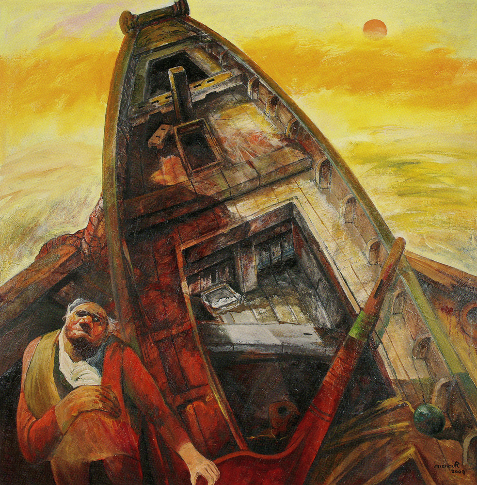 私は、北海道稚内市生まれとなっているが、実は樺太海馬島に生まれた。昭和19年日本の敗戦を目の前にして、ソ連軍が海馬島に侵攻、島民は昭和19年秋、北海道から来た漁船にて深夜島からの脱出が始まった。私の7歳の時の記憶が絵の制作のうえで、海の男、港に生きる人々を現在も描き続けています。