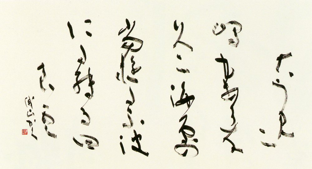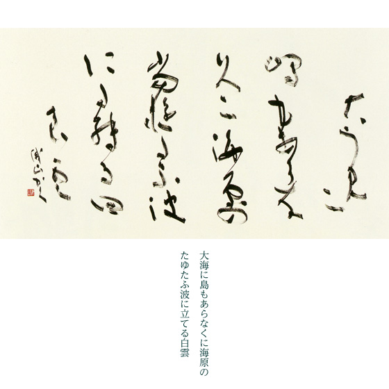 萬葉大海の歌一首を、横形式に大字表現したもの。字数が一首だけで少ないため、濃墨で大胆にの思いから、線は強く力を内に秘めながら、それぞれの行の変化と、行と行の響き合いに配慮した。また行間を広くとり、明るくと思った。しかし初めに考えた、スケールの大きい作品は実現しなかった。