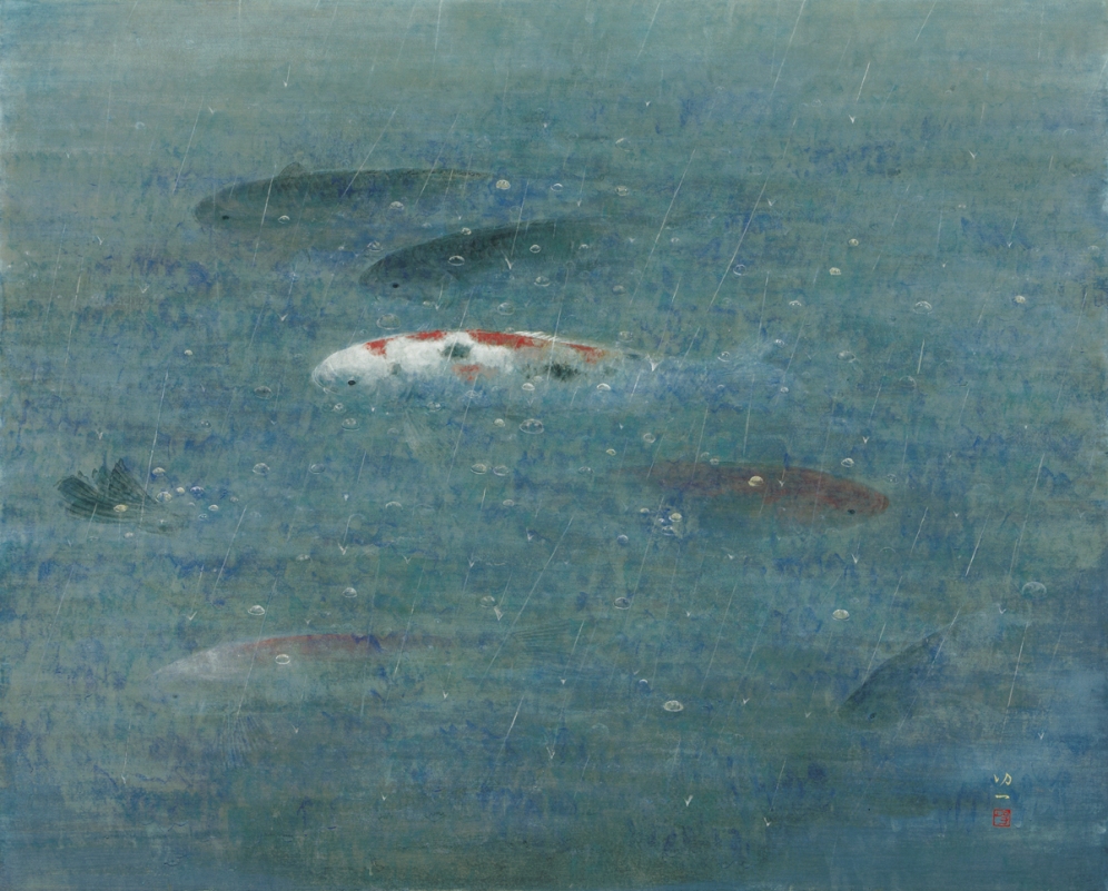 近くに柳沢吉保邸、六義園があります。中央に大きな池があり、形の良い松が張り出していて、出品画にすべく梅雨の晴れ間に写生に出かけました。そこは鯉のエサ場になっており大きな鯉が体をくねらせ反転しながら、多くのアワの中にエサを求めて泳いでいる姿を見て興味をひかれ写生を始めました。折からの雨も趣を添えてくれました。