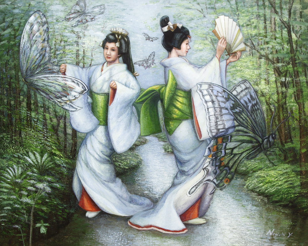 京都で芸妓さんや舞妓さんの踊りを見ました。きらびやかな衣裳や艶やかな所作に目を奪われ、楽しいひと時を過ごしました。中でも、蝶と舞扇が右に左に、追いつ追われつする場面が面白いものでした。山深い新緑の世界を背景にして、蝶と扇の精がしなやかに踊る舞姿を描いてみたいと思いました。