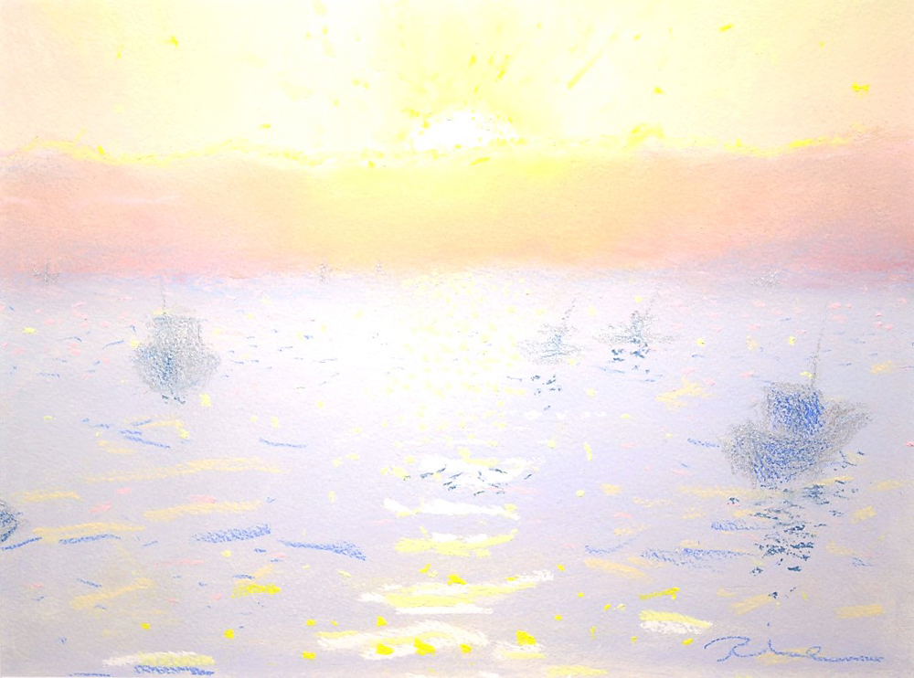太陽の光が水面に映り、キラキラと輝く一瞬を描きたくて船に乗り海に出ました。