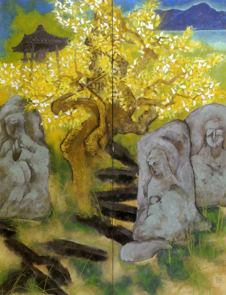 因島に白滝山がある。其処には、大、中、小、その他様々な石仏が山全体を埋め尽している。友達と山道の段々を追いながら進むと険しく、汗も滲み、辛苦労だんだんと強くなる。 もう少しで頂上だと思いながら登る。その時、鐘の音色が森閑の木々の葉を揺する響きに腰を伸ばし顔をあげると、空は澄みきった青色。 晩秋に染められた黄金の銀杏、太陽の光を受け、松の緑と相い和した自然の美に感動を受ける。頂上への道の両側に野仏の優しい微笑を受ける。その折、海から吹き登って来た潮風に背を押されて、一層の静寂を身に感じ絵の中にいるような思いであった。